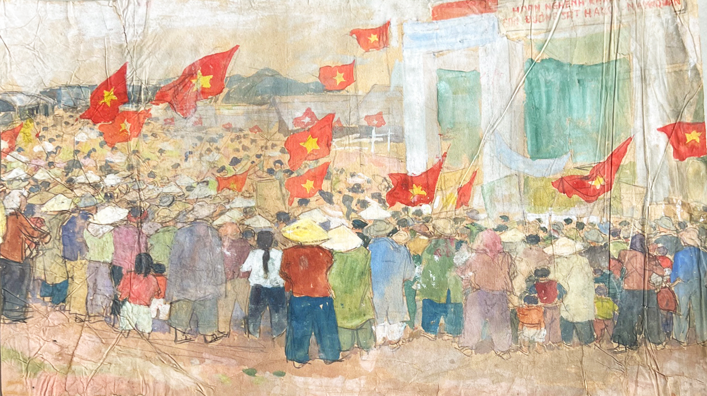 As a professional artist, Hiêm travelled far and often, carrying the works he created in a large tin tube (ống thiếc).3 His considerable bodies of work documented battlefields, soldiers and the local population from Long Châu Hà Province to Military Zone 9, through the districts and towns of Chắc Đăng, Đập Đá, Huyện Sử, Thới Bình, to Cái Nước, Cầu Rau Dừa. One such series depicted his experience of the Battle of Tầm Vu with gouache, detailing the initial attack and the final victory of Việt Minh forces, the capture of enemy trucks, 105mm artillery guns and French soldiers. His images were later published in the newspaper Gunfire (Tiếng Súng Kháng Địch), praiSed for their realism and detail. During this time, Hiêm married Trần Thị Châu, who offered invaluable support for Hiêm and even travelled with him on assignments.