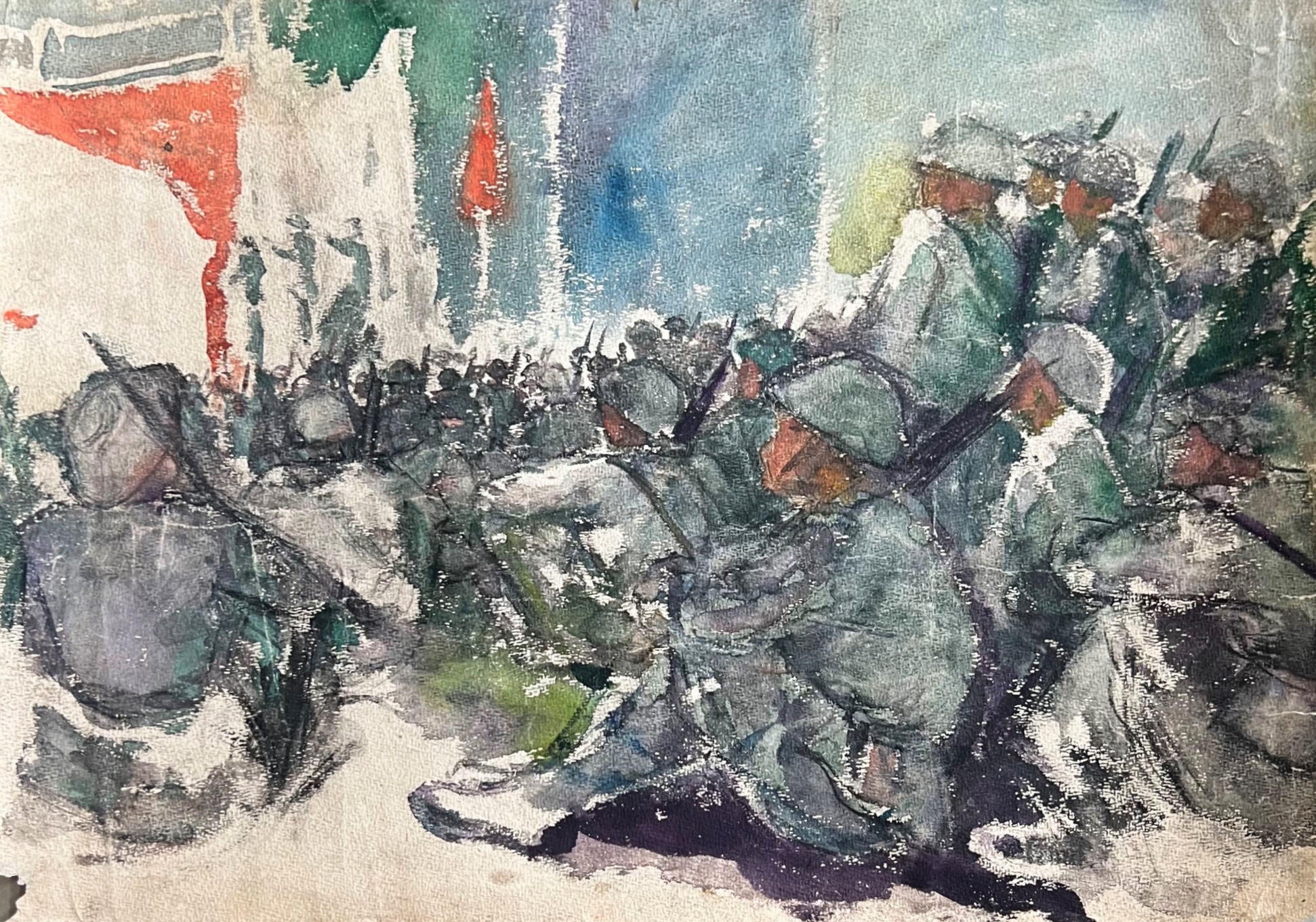On 5 November 1954, Hiêm travelled on a Soviet ship (Xta vơ rô bôn) carrying over 2000 soldiers from the Sắc River in Cần Thơ Province to the South China Sea.4 During the trip, Hiêm painted life on the deck, in the holds. On 7 November, Hiêm painted female singers from the Voice of The South troupe (Tiếng nói miền Nam), Việt Minh soldiers and a delegation of Russian sailors celebrating the Soviet Union’s Revolution Anniversary. The ship arrived at the port town of Sầm Sơn on the morning of 9 November. Disembarking before the others, Hiêm camped under a cluster of casuarina trees to document arrival, almost completing the painting “Going Through Sầm Sơn Gate” (Qua Cổng Sầm Sơn) on the spot. With the works he created, Hiêm took part in the 1954/1955 National Fine Arts Exhibition in the capital, Hanoi. He participated with 30 selected paintings on the theme of the southern resistance and won the grand prize.