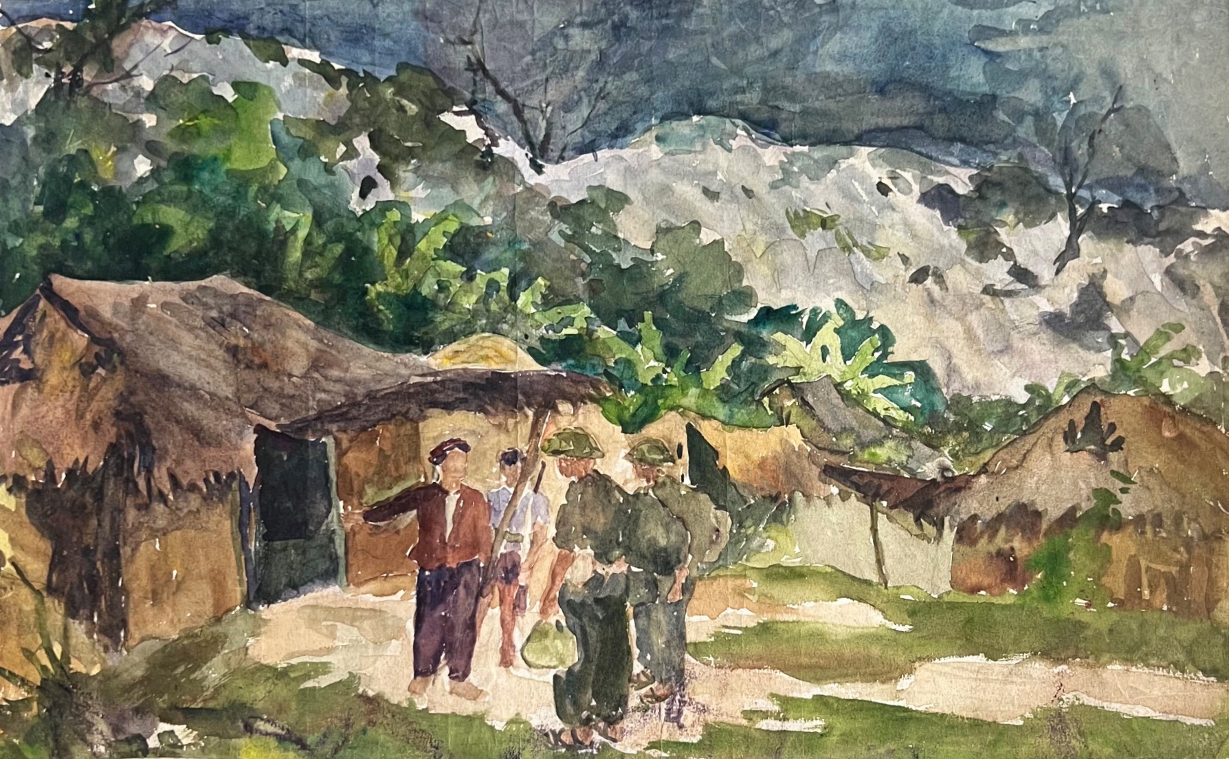 In July 1954 a ceasefire was declared leading to end of the First Indochina War in August. This began the mass movement of people from South Vietnam to North Vietnam, and vice versa, as part of the Geneva Accords signed in July 1954. As he moved constantly, Hiêm left painting tubes with families in certain locations for safe keeping. Upon receiving the order to evacuate (lệnh tập kết) Hiêm defied orders and travelled to a civilian’s house to collect a tube before the family burnt the paintings in fear of marauding French soldiers.